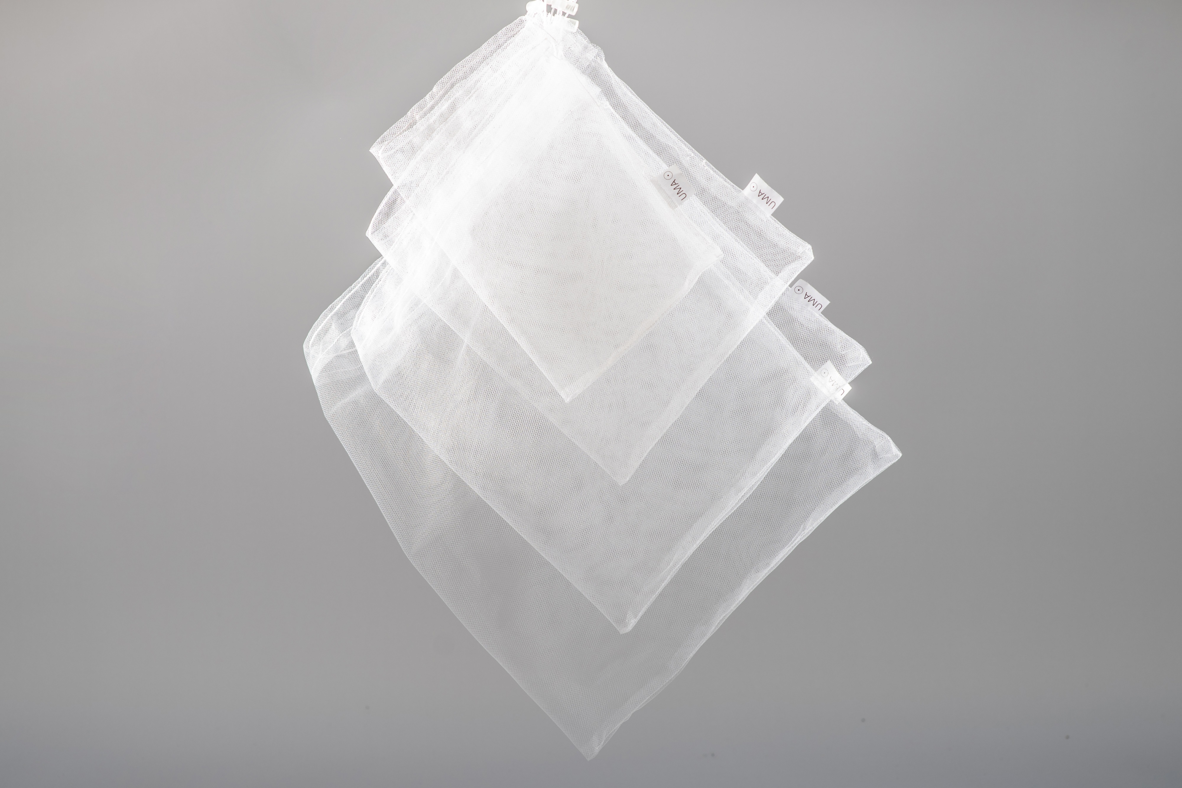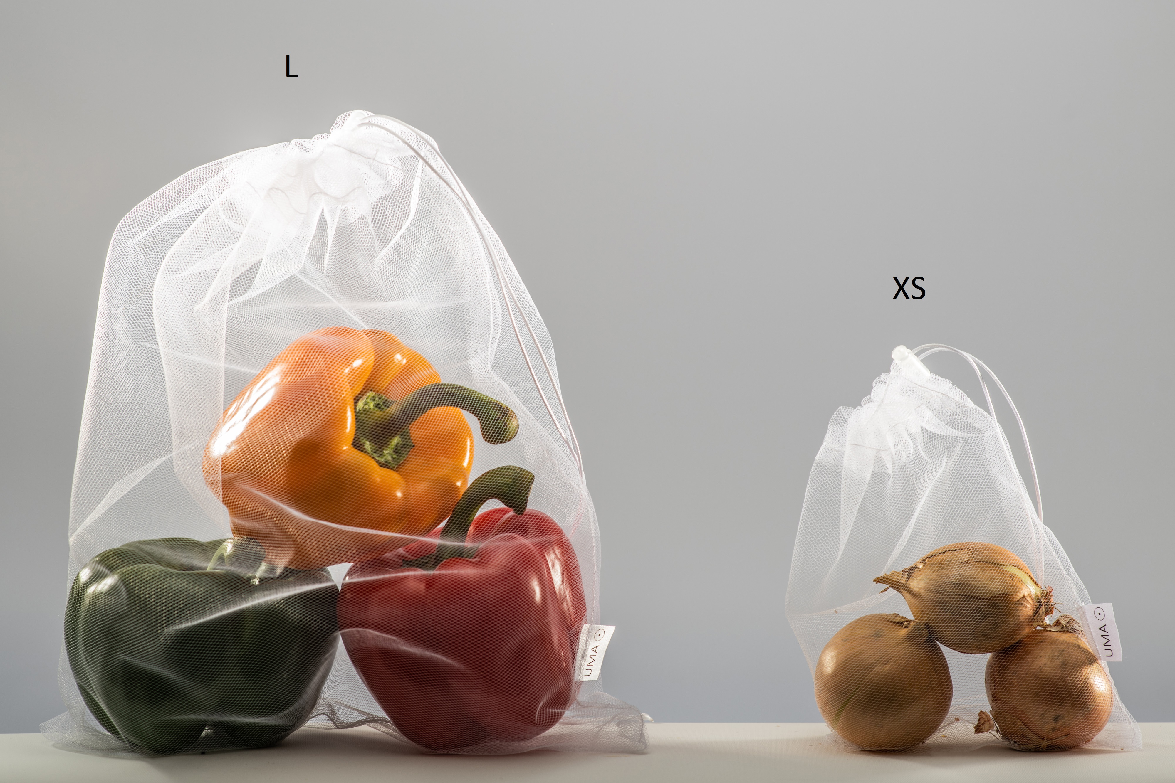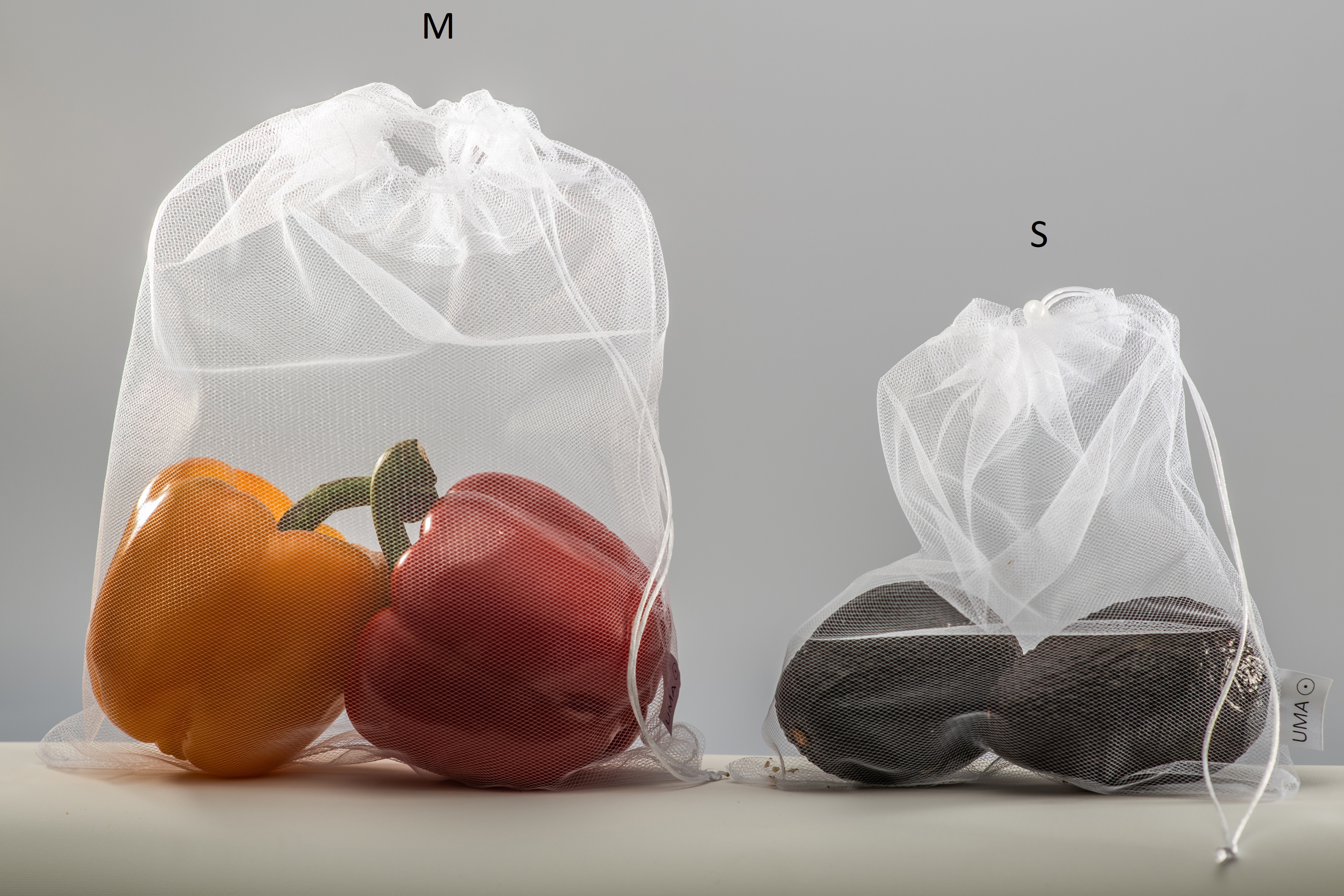 Daugkartinio naudojimo, permatomi XS, S, M, L dydžio maišeliai. Maišeliai turi fiksatorius, kurie užtraukiami virvele, neleis produktams išbyrėti. Pagaminti iš permatomos, ypač lengvos, bei tamprios medžiagos. Siekiant kuo didesnės kokybės, maišelių krašteliai susiūti du kartus. Uma maišiukus galima skalbti rankomis arba skalbimo mašina iki 40° C temperatūros.